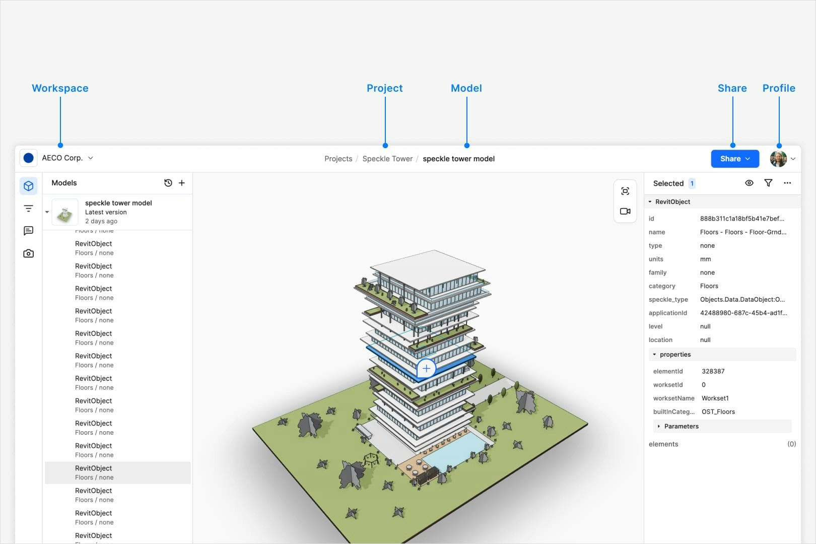 - Navigation (center): Shows your location in Speckle: All Projects → Project → Model