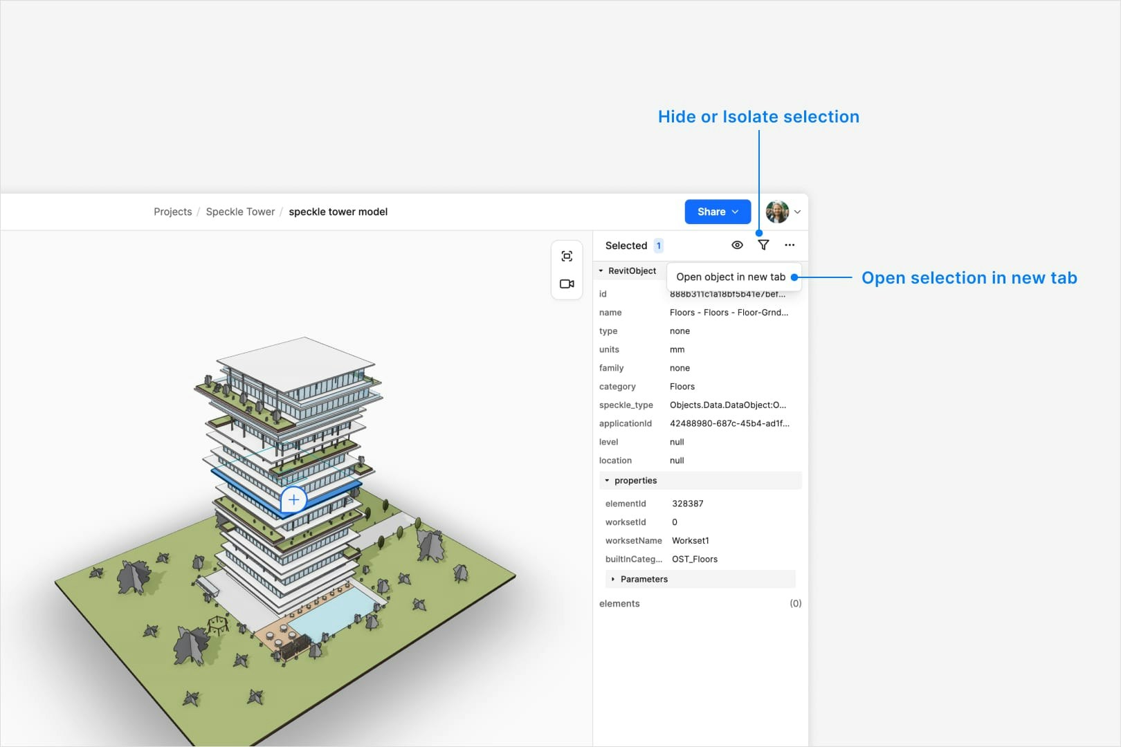 Speckle is a platform designed to streamline data exchange and collaboration in the architecture, engineering, and construction (AEC) industries. It connects various design and modeling software—such as Revit, Rhino, Grasshopper, AutoCAD, and others—and enables the extraction of detailed object properties from each. Each software plugin in Speckle translates native objects (like walls, beams, or curves) into a standardized Speckle format. During this process, key properties—such as geometry, materials, dimensions, and metadata—are captured and stored in Speckle. These properties remain intact and are accessible regardless of the originating software. Once extracted, Speckle allows users to visualize and explore these objects and their properties in a web-based 3D viewer using the Selection info panel.