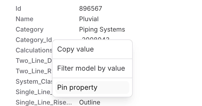 - Filter model by value: Start a filtering session from that property/value.