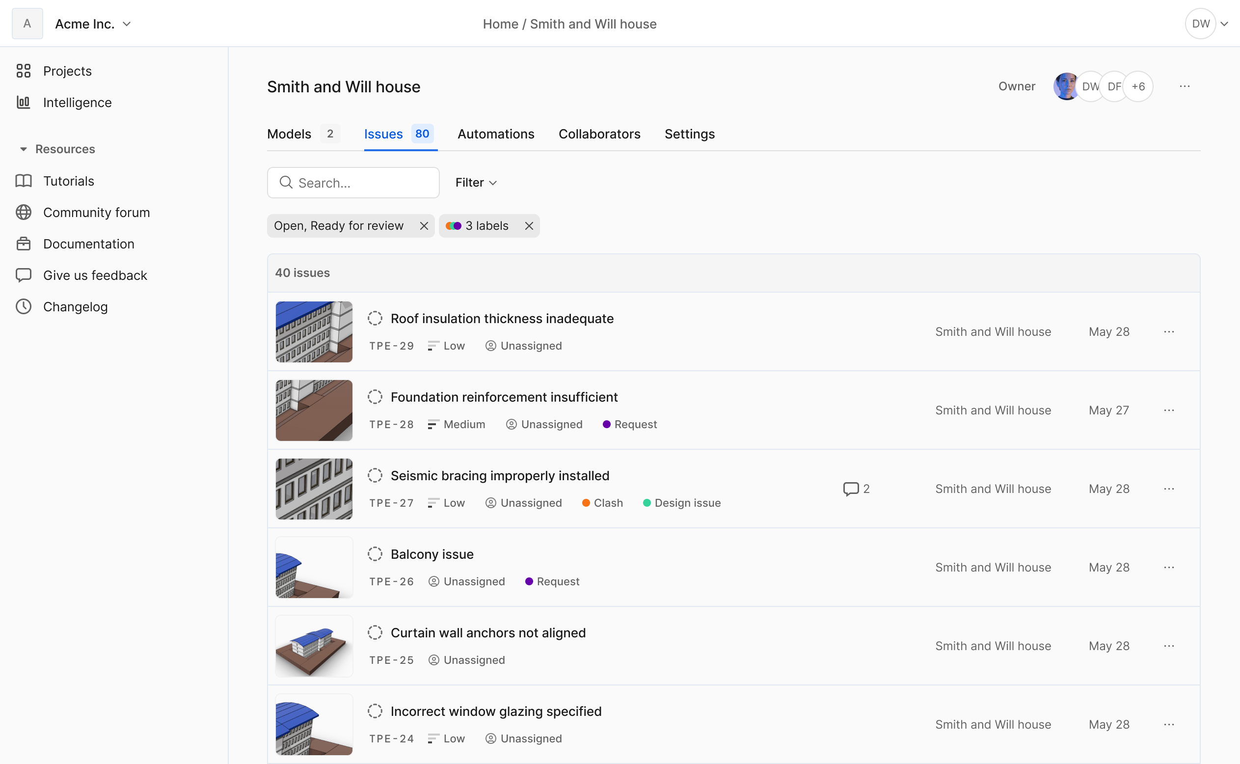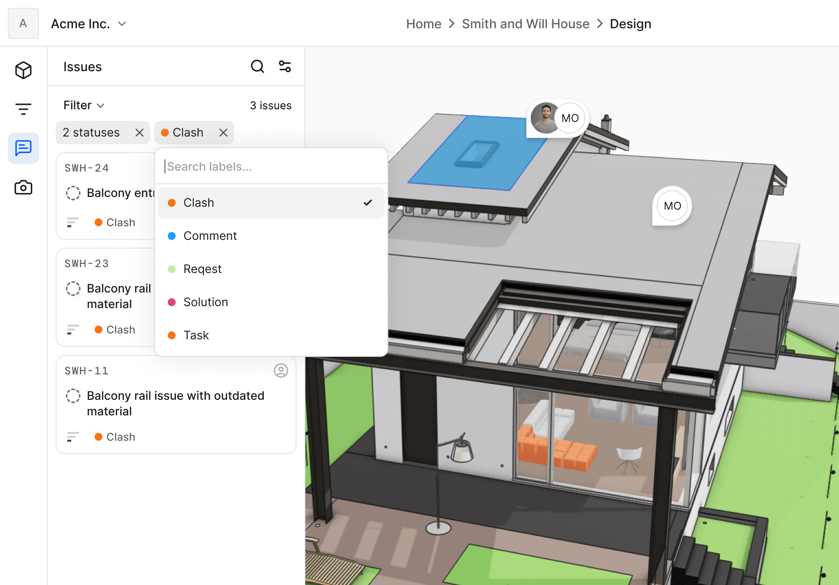 Issues are accessible directly in your desktop applications through Speckle connectors for Revit, Rhino, SketchUp, Navisworks, and other supported applications. When you load a model in a connector, you’ll see an issue icon with the count of open issues. Click it to view the full list of issues for that model, complete with all properties like labels, priority, and assignees. Click any issue to see the associated object highlighted in your host application. This lets you address problems without switching between your desktop app and the web interface.Can I create issues from the connector?