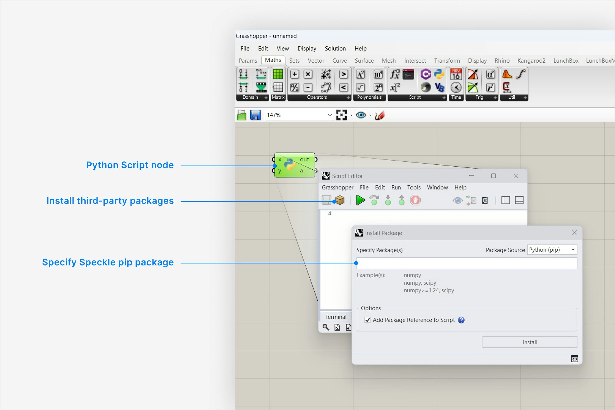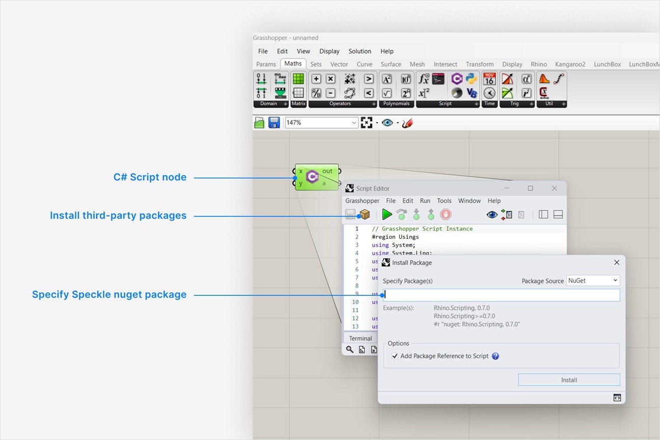- In Grasshopper, paste the copied value into the Specify Package(s) field and click Install.